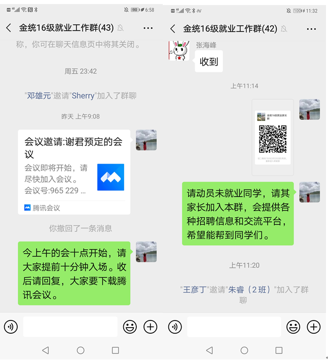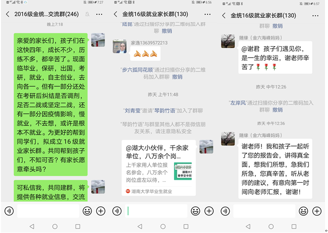 第二,发挥家长的作用,用亲情调动大家。年级建立“金统16级就业家长群”,搭建学校与家庭沟通的桥梁,实现家校联合,为家长了解学校助力毕业生就业的相关政策和平台提供渠道;调动家长的资源,为学生了解就业信息和增加升学机会提供动力。目前年级已有128位家长主动入群,家长与学院建立了密切的联系,信息畅通,在家长的鼓励与帮助下,很多同学重拾信心,找到方向,投递简历,效果显著。后续,学院将继续调动家庭这个大后方,动员家长的力量,为同学们的就业提供保障。