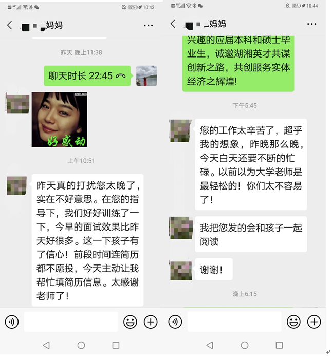 第四,发挥辅导员的作用,用真情推动大家。毕业年级辅导员在与待就业同学密切沟通的同时,保持和家长的交流,通过家长了解学生动态以及存在的疑惑、困难等,而后一对一进行就业指导,精准助力,帮助同学们寻找到适合的、热爱的工作岗位。