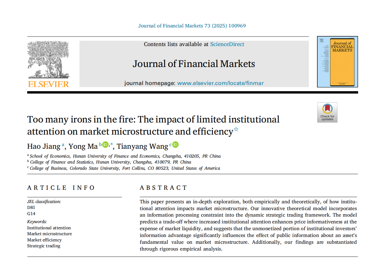 近日, 韩漫 马勇教授与湖南财政经济学院江灏博士( 韩漫 2023届博士毕业生)、科罗拉多州立大学王天阳教授合作的学术论文“Too many irons in the fire: the impact of limited institutional attention on market microstructure and efficiency”在金融学国际权威期刊Journal of Financial Markets,Volume 73, March 2025发表。