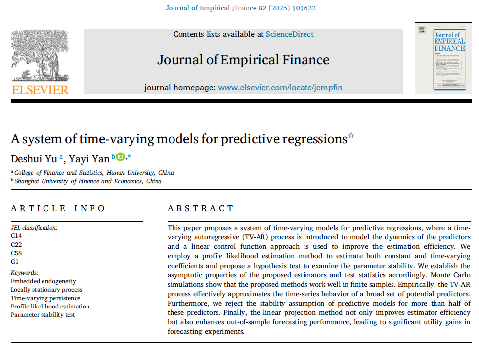 近日,学院金融科技与工程系余得水副教授的学术论文“A system of time-varying models for predictive regressions”在金融学权威期刊Journal of Empirical Finance发表,volume82, June 2025发表。