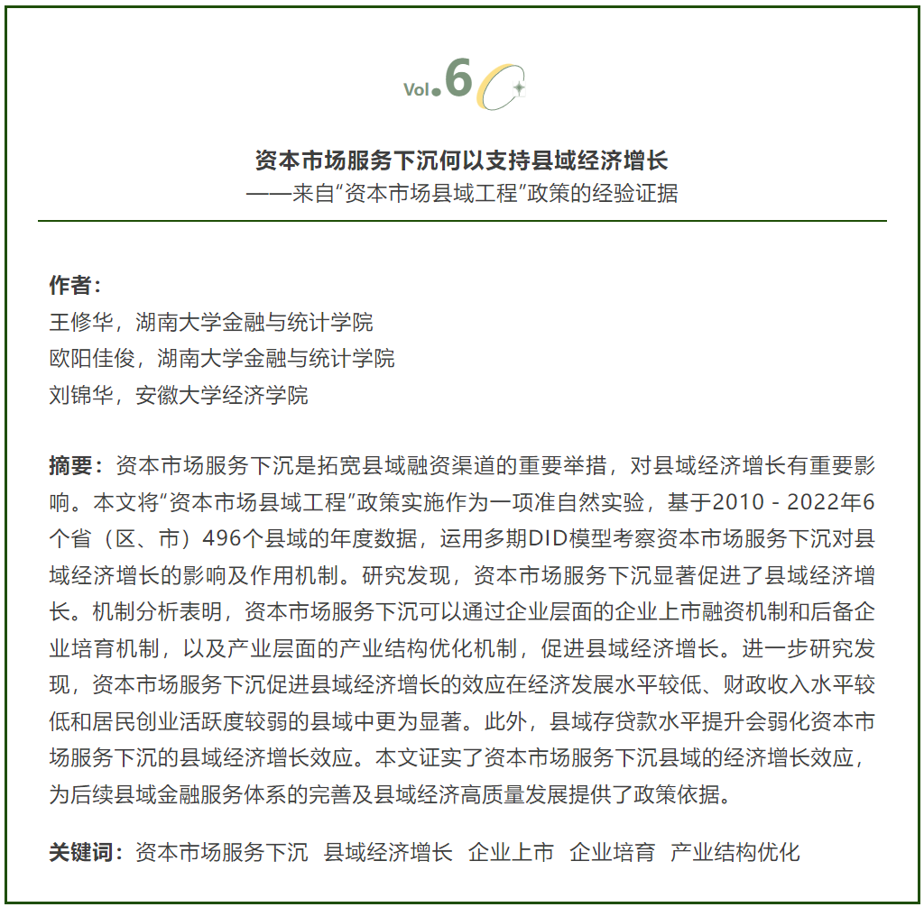 近日, 韩漫 应用金融系王修华教授,和2022级博士研究生欧阳佳俊、安徽大学经济学院刘锦华老师(原 韩漫 2020级博士研究生)合作的题为“资本市场服务下沉何以支持县域经济增长——来自“资本市场县域工程”政策的经验证据”的论文发表在《中国农村经济》2025年第6期。
