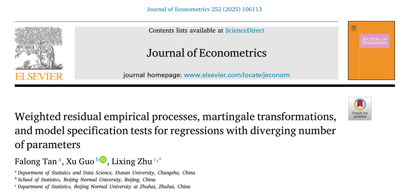 近日, 韩漫 谭发龙教授在高维统计领域取得研究进展,研究成果以“Weighted residual empirical processes, martingale transformations, and model specification tests for regressions with diverging number of parameters”为题在计量经济学国际期刊Journal of Econometrics在线发表。