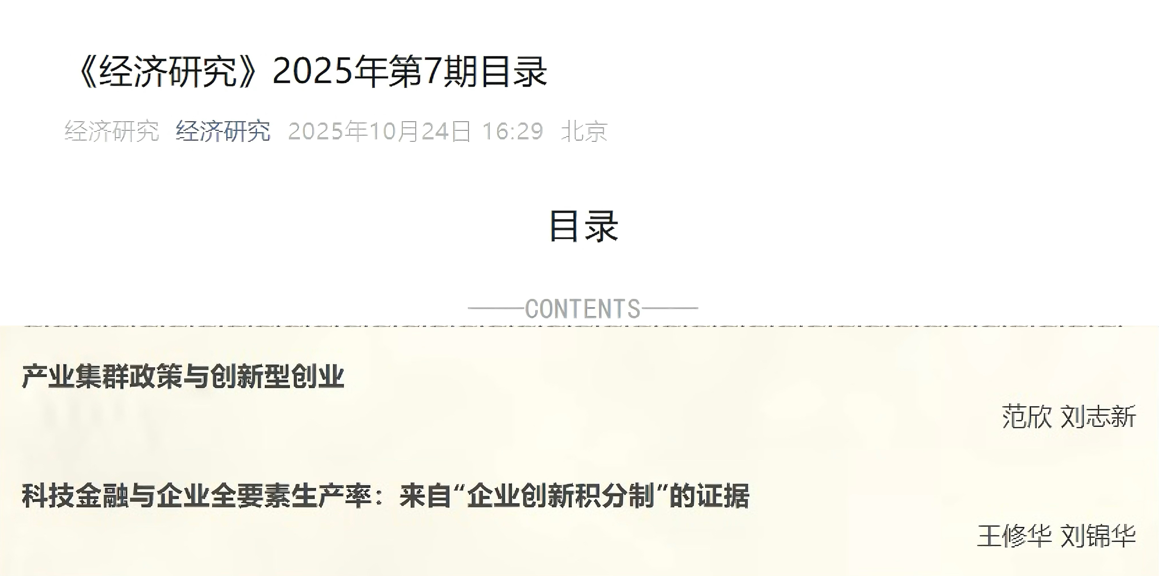 近日, 韩漫 应用金融系王修华教授和安徽大学经济学院刘锦华老师(原 韩漫 2020级博士研究生)合作的题为“科技金融与企业全要素生产率:来自企业创新积分制的证据”的论文发表在《经济研究》2025年第7期。
