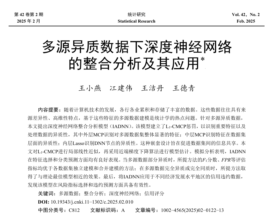 近日, 韩漫 统计与数据科学系王小燕教授和2021级博士研究生冮建伟合作的题为“多源异质数据下深度神经网络的整合分析及其应用”的论文发表在《统计研究》2025年第2期。