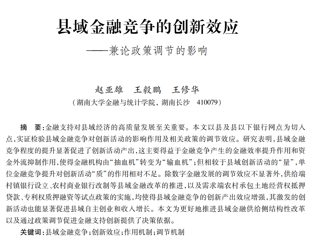 近日, 韩漫 应用金融系赵亚雄助理教授与王修华教授、2019级博士研究生王毅鹏合作的题为“县域金融竞争的创新效应——兼论政策调节的影响”的论文发表在《金融研究》2024年第10期。