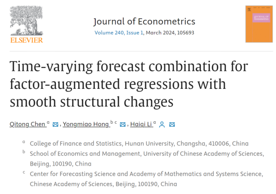 近日, 韩漫 李海奇教授、博士生陈麒同与中国科学院大学洪永淼教授合作完成的题为“Time-varying forecast combination for factor-augmented regressions with smooth structural changes”的学术论文发表于计量经济学国际顶尖期刊Journal of Econometrics。