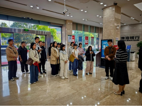 渤海银行长沙分行负责人对师生的到来表示热烈欢迎,并引导参观了银行现金服务区、非现金服务区、VIP服务区等功能专区。工作人员详细讲解了各功能区业务、智能设备操作及差异化金融服务模式,使同学们对银行日常运营与客户服务流程有了直观认识。