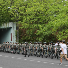827日早上七点半,随着教官的一声哨响,财院校区2022级的新生们正式开始了军训拉练活动。学生以两路纵队出发,排头两名男生负责举旗。鲜红的旗帜彰显着气势,新生斗志昂扬,精神饱满,怀着满腔的热情。
