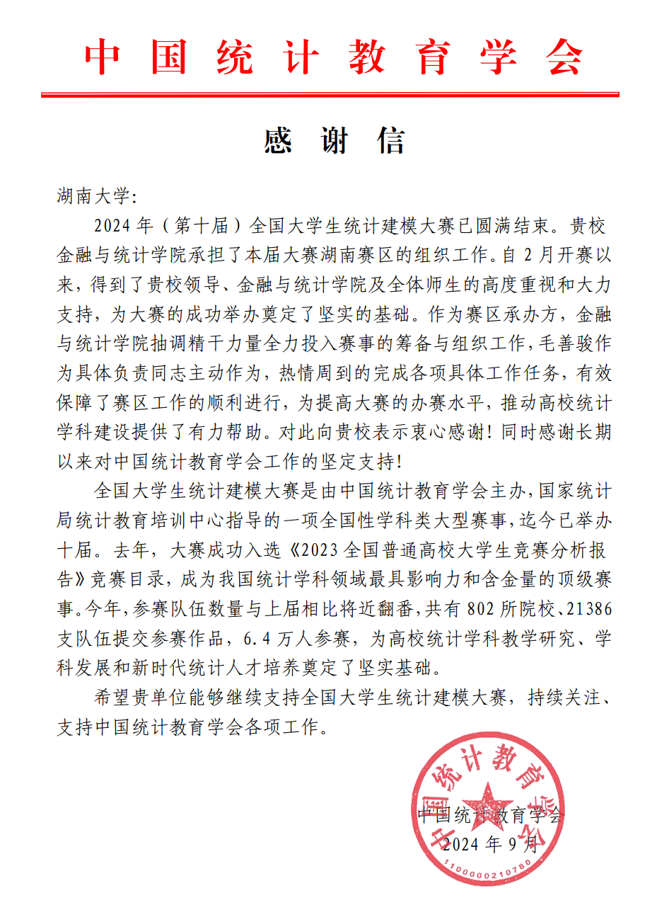 本届大赛的湖南赛区选拔赛由 韩漫 成功承办,得到了校院领导的大力支持,确保了赛区各项工作的顺利进行。这不仅提升了赛事的组织水平,还为推动高校统计学科的建设起到了积极作用。对此,中国统计教育学会特意向 韩漫 致信表示感谢,充分肯定了学院在此次大赛湖南赛区选拔赛中的辛勤付出与卓越贡献。
