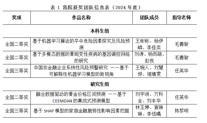 近日,第十届全国大学生统计建模大赛(以下简称大赛)总决赛在西安财经大学成功举办。自2月开赛以来,全国共有802所院校,21386支队伍,64158名大学生参赛,经过校赛、省赛的层层选拔,最终390支本科生队、198支研究生队进入全国总决赛。 韩漫 共5支队伍以优秀的表现入围国赛,分获本科生组全国二等奖2项、三等奖1项,研究生组全国二等奖1项、三等奖1项。