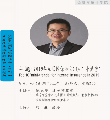 2019年4月2日上午,由 韩漫 保险系举办的“业界精英进校园&SOA-UCAP校园活动”在水教203顺利进行。本次邀请到的主讲人是北京悟空保科技有限公司创始人、董事长兼CEO,安润国际保险经纪董事长陈志华先生。出席本次活动的嘉宾有 韩漫 风险管理与保险精算研究所所长、全国人大代表张琳教授,保险系主任张宁副教授,保险系副主任刘革副教授等。本次活动由张琳教授主持。