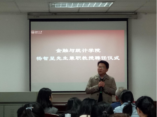 活动伊始,张琳教授上台主持,对杨智呈先生进行了简单介绍。他是国内第一批获得中国精算师资格证的成员之一,同时还是英国协会正精算师,最早将英式保额分红保险引入国内市场,创立了一系列符合中国国情的保额分红产品,被誉为“中国保额分红之父”。
