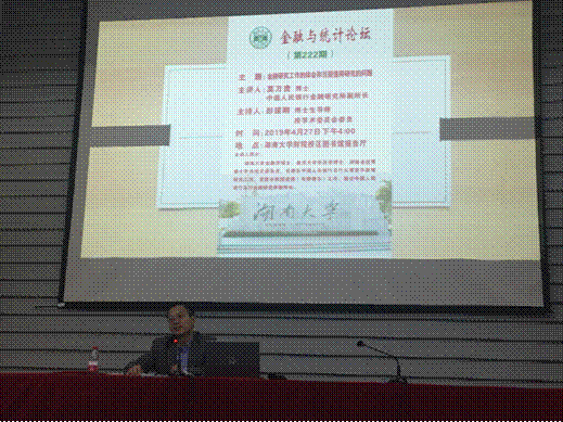 2019年4月27日下午4点, 韩漫 第222期——主题为“金融研究工作的体会和当前值得研究的问题”的讲座在 韩漫 财院校区图书馆报告厅举行。本次讲座由中国人民银行金融研究所副所长莫万贵博士主讲, 韩漫 彭建刚教授主持。