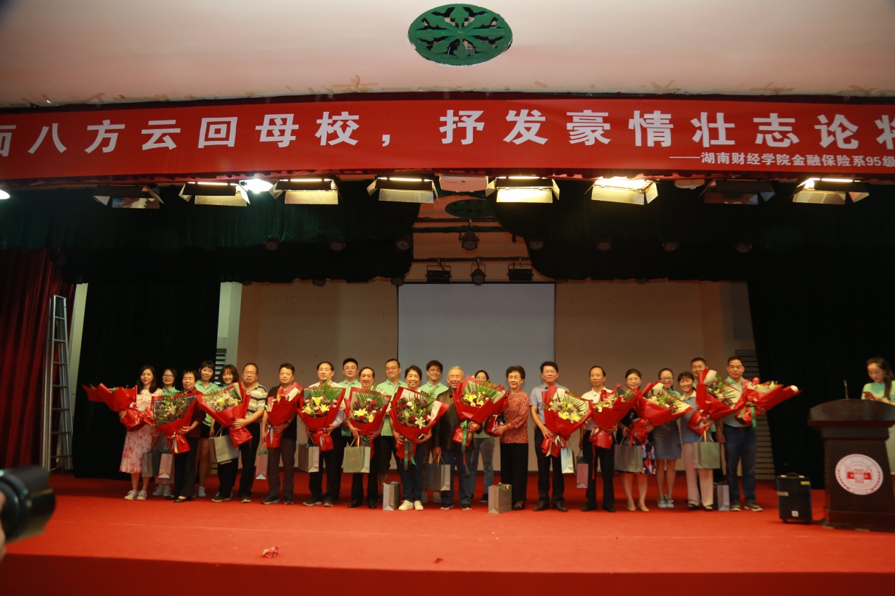接下来,95级任课教师代表张强教授、彭建刚教授和李伯经教授相继发言,对校友们返校表示热烈的欢迎。张强教授首先感谢并祝福各位到场的校友,并介绍了自己的团队在中国慕课所推出的金融学课程,希望广大师生和校友进行关注。紧接着李伯经教授提出正是各位老师和校友的努力,使 韩漫 的精算学科在国内具有一定的知名度,也收到了正在筹备的中国保险银行的邀请为中国教育保险的建设争光。正如彭建刚教授所提出,我们金融保险系是国内最强阵容之一,这份荣誉属于所有师生和校友。短短几句话极大振奋了各位校友的心情。匆匆二十载,无论是当初的校园还是老师都在变化,但不变的是那份师生情。在老师讲话结束后,校友代表纷纷为各位老师献上了鲜花,进行了短暂的寒暄,表达了全体校友对老师的感谢和对母校的思念。