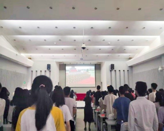 报告厅里,学生代表们集体观礼。当习总书记宣布“升国旗,奏国歌”的流程开始时,大家自发站起立正。一个个挺拔的青年英姿,是社会主义最帅气且动人的建设者和接班人。