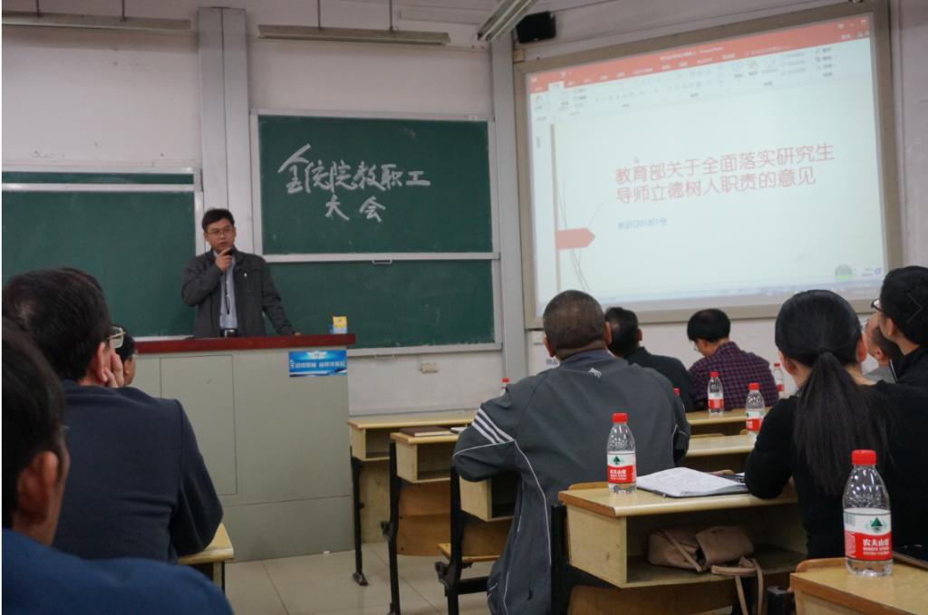 李海奇教授对《教育部关于全面落实研究生导师立德树人职责的意见》做了重点解读,明确各位导师应不忘初心,起到引导和教育学生的关键作用。并强调研究生教育应着重学术训练和育人本位,要从根本上提高研究生培养的质量;导师要为研究生提供全方位的关心和指导,特别是要以身作则,教育学生遵守学术规范,传承金统文化,将金融黄埔的名片擦得更亮。