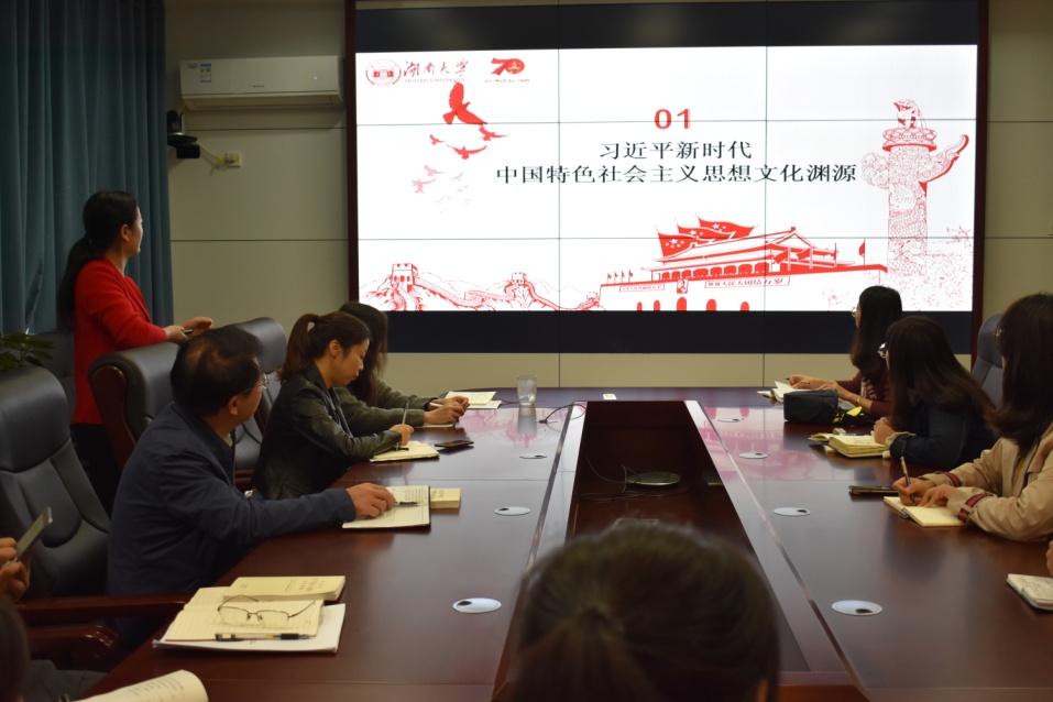 谢君书记带领行政教辅党支部从“习近平新时代中国特色社会主义思想文化渊源、习近平总书记关于宣传思想文化工作的重要思想、如何推进新时代中国特色社会主义文化建设”三个方面进一步深入感受习近平新时代中国特色社会主义思想的文化底蕴,培养文化自信,用社会主义核心价值观凝心聚力。