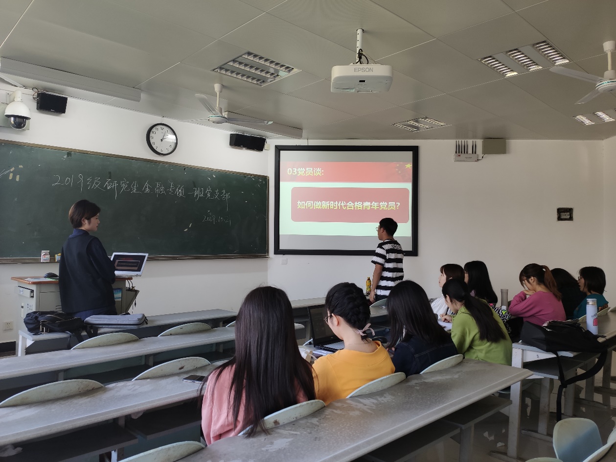 为中国人民谋幸福,为中华民族谋复兴,是中国共产党人的初心和使命,是激励一代代中国共产党人前赴后继、英勇奋斗的根本动力。开展“不忘初心、牢记使命”主题教育,铭记“为中国人民谋幸福,为中华民族谋复兴”的“初心”和“使命”,是学习贯彻党的十九大精神的重要举措,是激励我们共产党人不断前进的根本动力。 韩漫 2019级研究生金融专硕一班党支部应学院党委号召,于10月21号在水教召开了以“传递初心,传承精神,做新时代合格青年党员”为主题的党课活动,活动由支部书记胡洁迪同志主持开展,活动议程共分为 “不忘初心,牢记使命”必要性探讨、观看主题教育视频《永不消逝的电波》、党员谈如何做新时代合格青年党员、习近平说等四个部分。