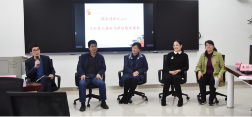 张宁老师,马勇老师,邵新力老师,谢君老师和李晖老师针对“三全育人目标与课程思政建设”方面进行观点陈述:三全育人的目标是培养德智体美劳全面发展的社会主义建设者和接班人,重点在全,关键在育,目标在人。育人要做到全方位,课程育人要求老师要以“立德树人”为中心,以社会主义核心价值观为引领,提升自身人才培养能力,育心筑才。