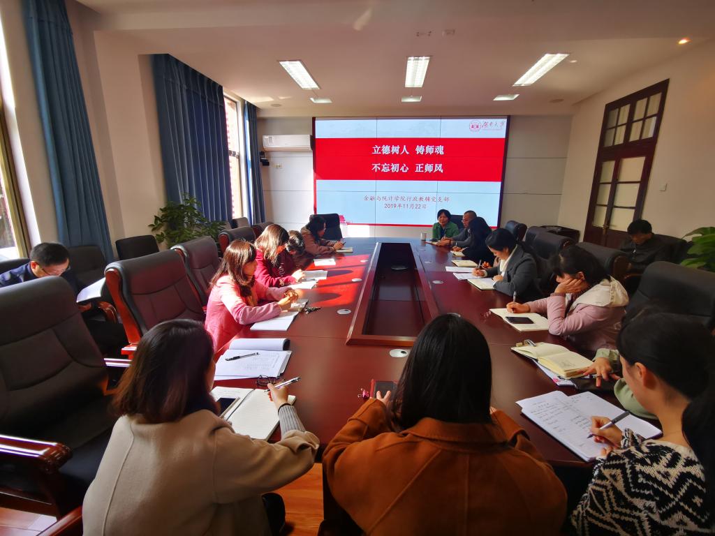 11月22日上午, 韩漫 行政教辅党支部在红楼226会议室开展 “不忘初心、牢记使命”学习讨论会。本次学习会由行政教辅党支部书记谢君主持,围绕“立德树人、铸师魂,不忘初心、正师风”主题进行交流讨论。学院行政教辅党支部16名老师参会。