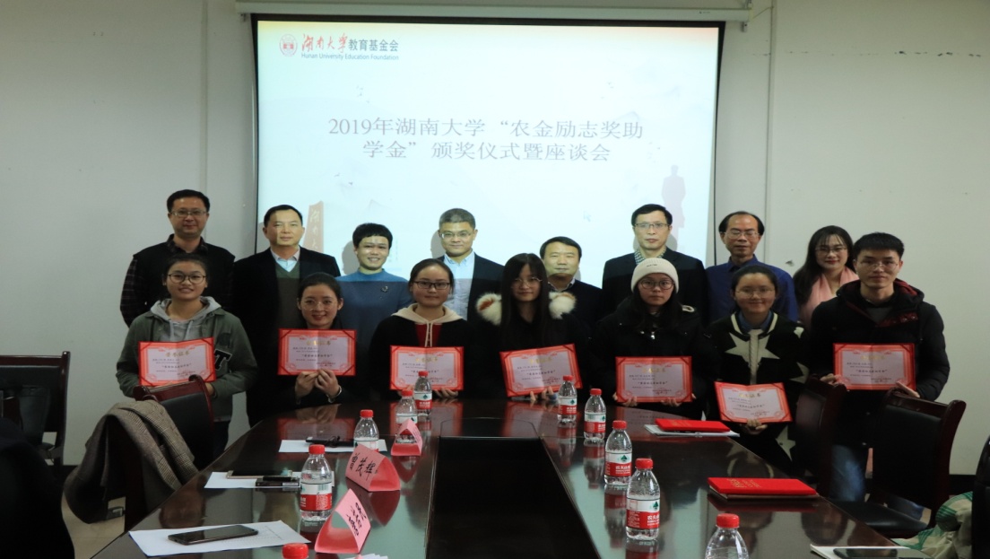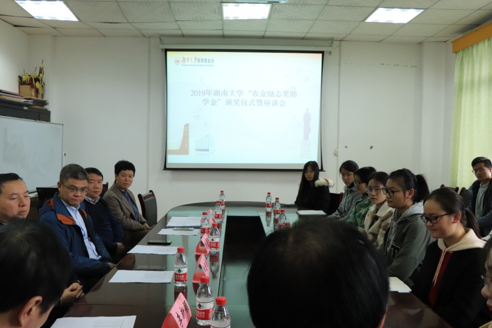 11月30日上午,2019年 韩漫 “农金励志奖助学金”颁奖仪式暨座谈会在 韩漫 财经校区行政楼707会议室顺利召开。 韩漫 原党委副书记刘周平老师, 韩漫 校友办主任张学陶老师, 韩漫 教育基金会刘垠杉老师 ,原湖南财经学院金融系农金931班校友唐若民先生、李新颖先生、申建国先生、曹茂辉先生、谭授仪女士五位校友代表出席了本次座谈会。此外,与会成员还有2019年“农金励志奖助学金”获奖学生代表10余人。