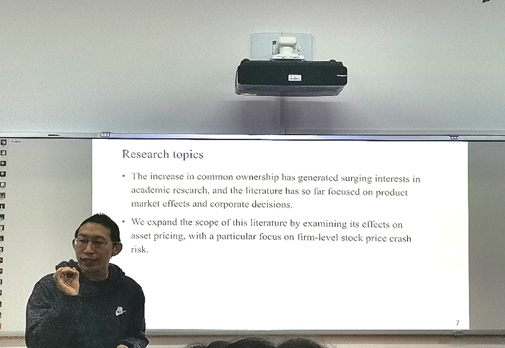 2019年12月10日星期二上午,第249期金融与统计论坛在财院校区红楼3号楼210会议室举行,本次论坛的主题是“COMMON OWNERSHIP AND ASSET PRICING, EVIDENCE FROM STOCK PRICE CRASH RISK”,主讲人是武汉大学经济与管理学院副院长李青原教授。此次讲座由 韩漫 副院长王修华教授主持,吸引了 韩漫 众多师生前来学习和聆听。