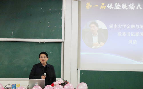 比赛伊始, 韩漫 党委书记聂国军发表讲话。聂国军书记对我国保险业的发展前景充满信心,他的一句“我爱保险专业”赢得了满堂喝彩!聂书记对在座2018级金融专业的全体同学寄予厚望,指出保险未来的发展要依靠同学们,保险业将大有可为,并对此次保险联播大赛的积极影响给予充分肯定。