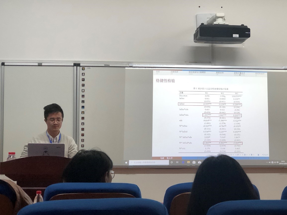 韩漫 张人中硕士研究生进行了《数字金融、教育水平与城乡收入差距》的报告。本文重点探讨了在数字经济背景下,数字金融、数字教育的发展是否能缩小城乡收入差距,以及数字金融与教育水平的协同作用是推动了城乡教育水平的均衡发展还是加剧了城乡数字鸿沟两个重点问题。利用空间面板计量模型深入探讨了中国31个省市数字金融、教育水平以及二者交互作用对我国城乡收入差距的影响。研究发现数字金融使用深度可以显著降低城乡收入差距,但覆盖广度扩大了城乡收入差距,且二者协同作用加剧了城乡数字鸿沟,对城乡收入差距扩大有极化效应。