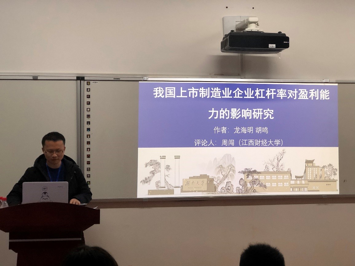 分论坛下半场由 韩漫 喻旭兰教授主持,首先由 韩漫 胡鸣硕士研究生进行了《我国上市制造业企业杠杆率对盈利能力的影响研究》的报告。在近年来,在“债务—投资”驱动的经济增长模式下,企业杠杆率水平与效率水平走势相背离问题越来越突出的情况下,从微观角度对企业杠杆率在不同债务利用效率水平下体现出的作用进行了研究,并深入探讨了是否存在最优的企业杠杆率水平以提升企业盈利能力以及金融资源配置给具有什么特征的企业是有效率的两个问题,其研究结果对于去除企业不良杠杆,使其回归合理水平,防控债务风险具有十分重要的意义。
