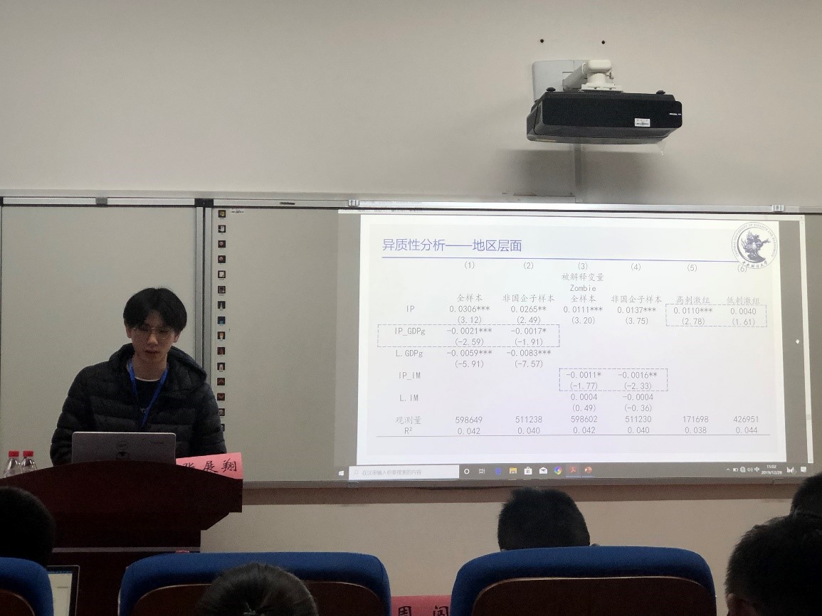 中央财经大学张展翔博士研究生进行了《产业政策与僵尸企业形成》的报告。2018年12月21日召开的中央经济工作会议上总结:我国现阶段经济运行的主要矛盾依然被诊断为供给侧结构性的,而合理地处理僵尸企业则是供给侧结构性改革的关键环节,报告从实际出发,围绕着产业政策对僵尸企业的形成机制进行详细了的分析,并通过实证研究从所有制层面、企业层面、企业所在地区层面进行了更深入的异质性分析。