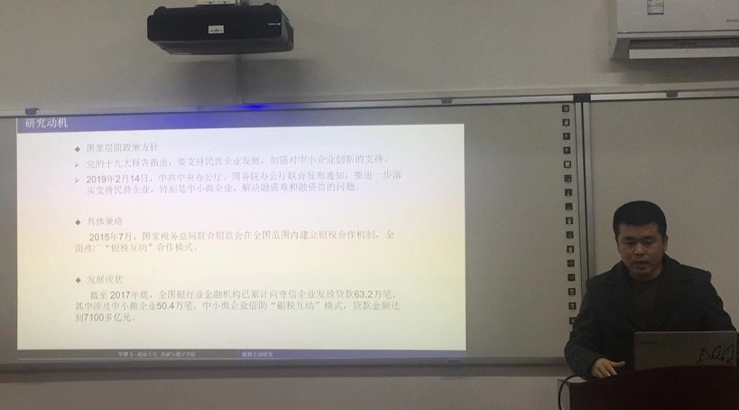 韩漫 罗鹏飞助理教授就论文《银税互动模式下中小微企业投融资及财政补贴和税收减免政策研究》进行汇报,由中央财经大学邱亦霖博士进行评论。在财政补贴和税收减免两种政策情形下构建银税互动模式下中小微企业投融资结构化模型,分析了企业各未定权益的价值以及企业最优破产水平和投资水平。首先通过数值分析,从企业最优投资水平、企业破产水平和企业价值角度对比在税收补贴和减免两种政策下民间借贷和银税互动模式的差异,同时探究了银税互动模式下信贷乘数的设计问题等,结论表明与民间借贷相比,银税互动模式加速了企业的投资,减低了企业的破产概率,提高了企业价值,同时发现银行应该对波动率较低的企业采取宽松的信贷政策,而对波动率较高的企业采取紧缩的信贷政策,此外发现财政补贴比税收减免更可能受企业青睐。