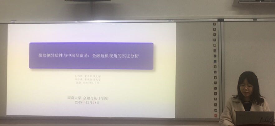 中央财经大学的邱亦霖博士就论文《供给侧异质性与中间品贸易:金融危机视角的实证分析》进行汇报,由 韩漫 罗鹏飞助理教授进行评论。邱亦霖博士等以金融危机为切入点考察了中间产品进口对纯内销企业总产出的差异性影响,实证结果表明金融危机发生后,由于供给冲击的影响,中间品进口对纯内销企业总产出的正向作用明显减弱,结合上下游产业链分析样本期间纯内销企业上游行业产能削弱了中间品进口对于企业总产出的正向边际作用,同时增强了对企业总产出的正向作用,这在一定程度上缓解了中间品供给所带来冲击的影响。