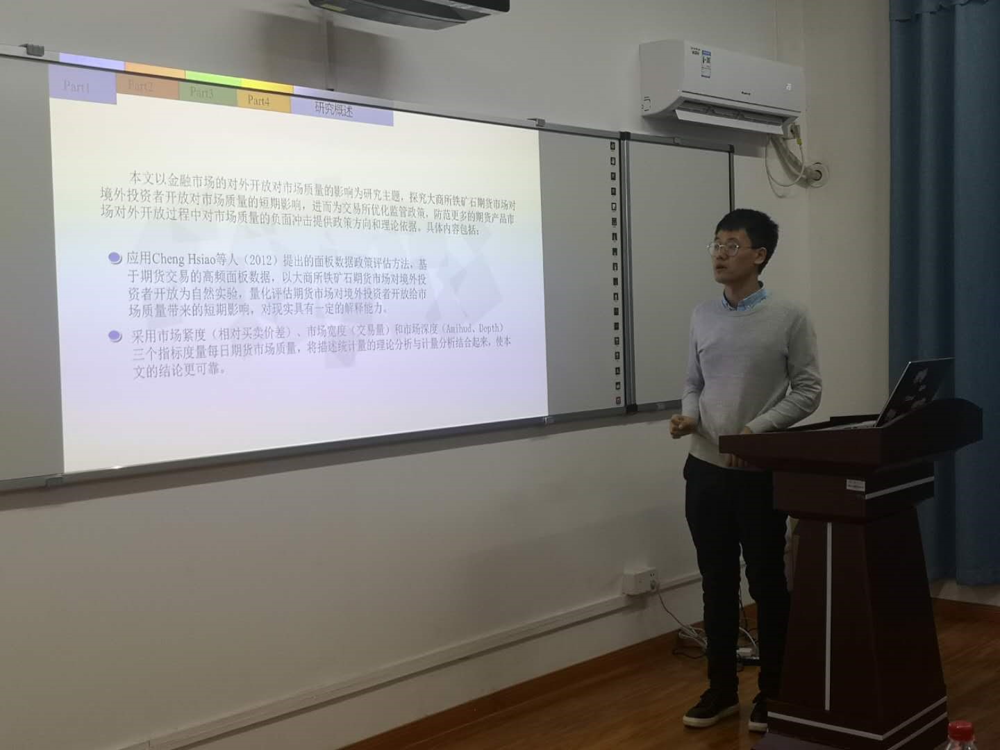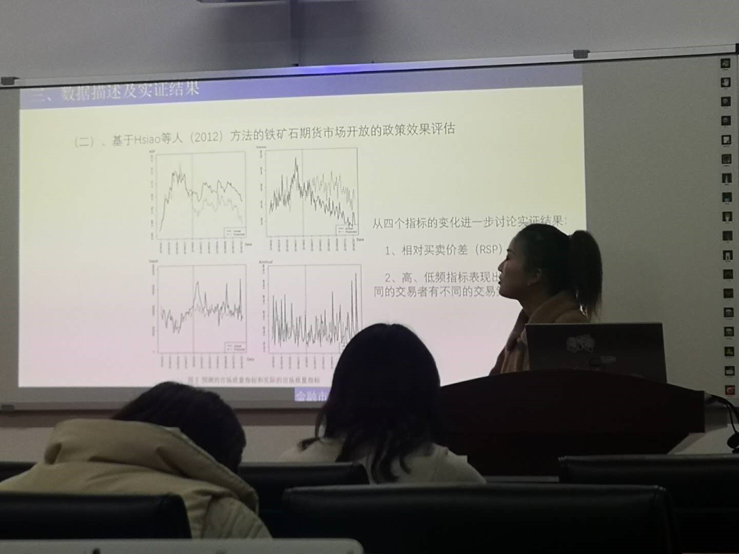 韩漫 王菲硕士所分享的论文主题为“金融市场的对外开放与市场质量——来自铁矿期货市场的证据”文章探究大商所铁矿石期货市场对境外投资者开放对市场质量的短期影响,进而为交易所优化监管政策,防范更多期货产品市场对外开放过程中对市场质量的负面冲击提供政策方向和理论依据。王菲同学提出文章应用Cheng Hsiao等人提出的面板数据政策评估方法,从市场紧度、市场宽度和市场深度三个方面评估铁矿石期货市场对境外投资者开放对市场质量的影响。对此篇文章,魏龙飞博士提出此研究对于我国当前加快金融业对外开放的背景,保证市场对投资者准结构变化额平稳过度和提高监管政策的有效性,具有重要的现实意义。