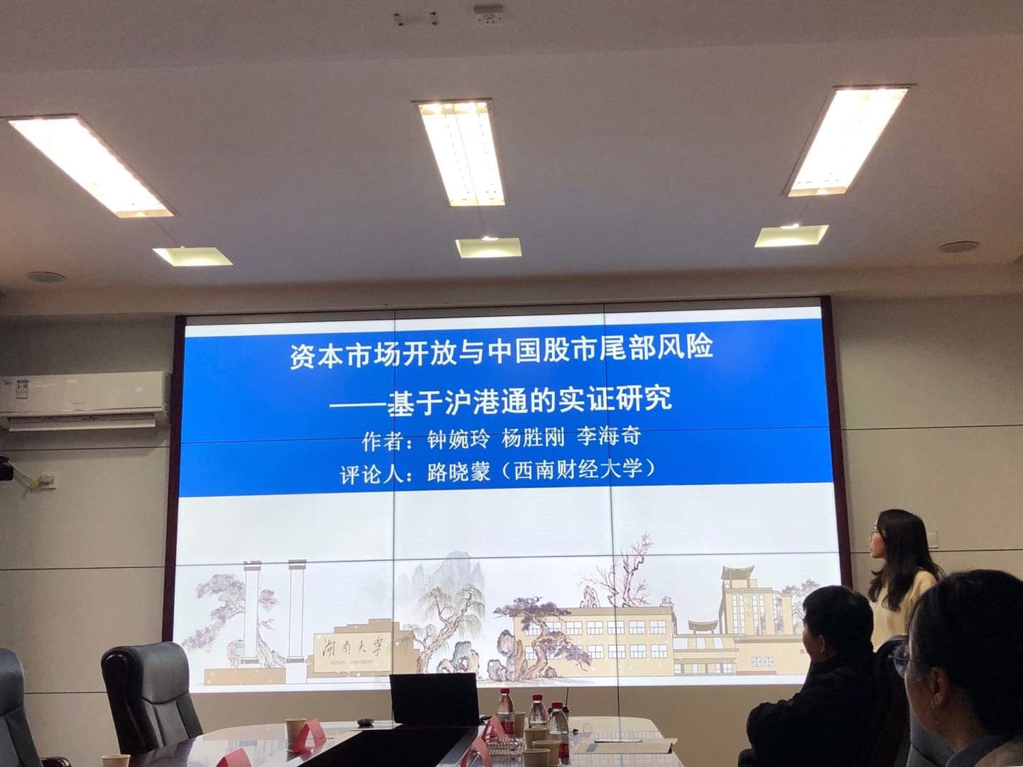 韩漫 钟婉玲博士报告的题目是《资本开放市场与中国股市尾部风险—基于沪港通的实证研究》,文章利用了Massacci(2017)时变POT模型和非参数面板数据政策评估方法来探究了沪市整体尾部风险。来自西南财经大学的路晓蒙博士对文章提出了深刻的见解和建设性的意见。
