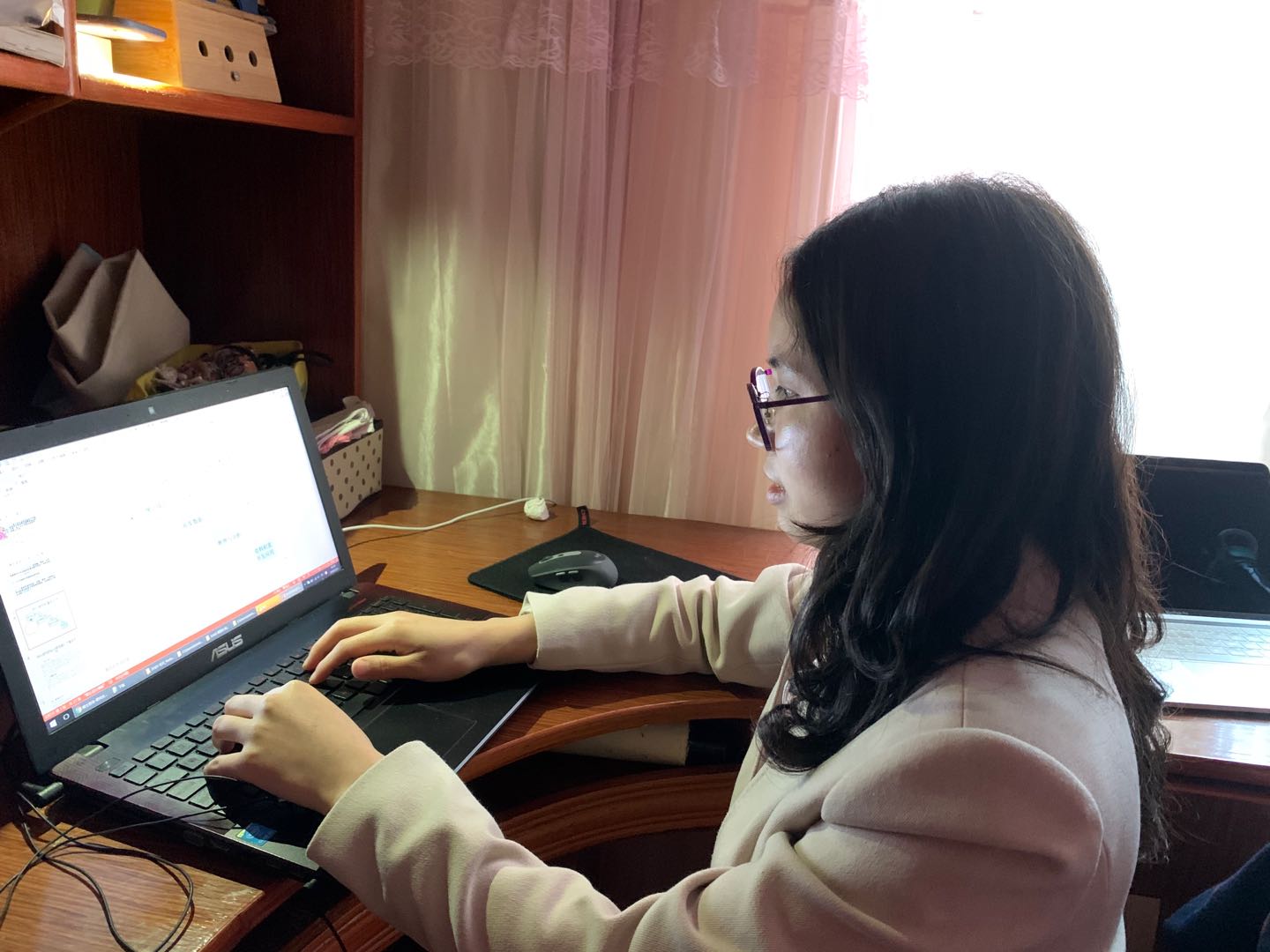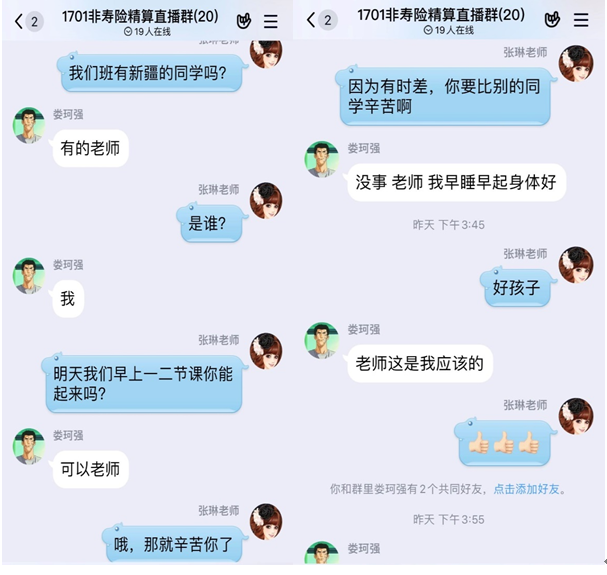 在家中准备教学课件时,张老师始终牵挂着那些偏远地区的学生。在张老师的班级中有一位新疆的学生,因为新疆有2个小时的时差,张老师特意提前关心其是否可以准时上课,而学生痛快的回答也让张老师深感欣慰。虽然线上授课面临重重挑战,但相信有全校师生的同心协力,定能共克时艰,打赢这场疫情期间的教育保卫战!