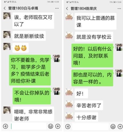 为了做好的线上教学工作,半个月前,龙老师已完成雨课堂平台的注册和认证、教学班级设置、课程群建立等一系列教学准备工作。开课后,龙老师每天都会收到同学们各种“求救”信息,她都会耐心细致的解释,并想办法解决。管理1803班的白马卓嘎同学,住在美丽遥远的西藏乡村,网络和信号都难以支撑听课需要,因为担心赶不上教学进度,十分焦急。龙老师急忙安抚了她,向她提供了详细的自学指导,让她尽力学习,并且承诺疫情结束后为她单独补课。