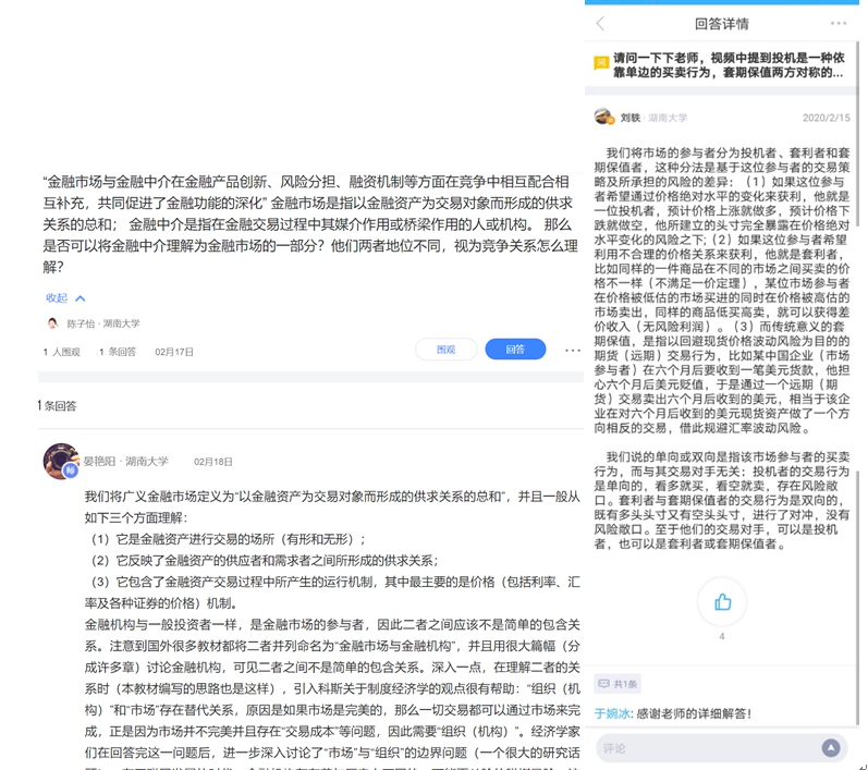 学生们以极高的热情参与着线上互动问答:截至2020年2月22日,投资学慕课平台的师生发起问题149个,累计回答1443条,平均每个问题有10条回答,最热的问题有124条回答。任课老师每天都在平台上认真阅读同学们提出的问题,并进行耐心细致的解答。