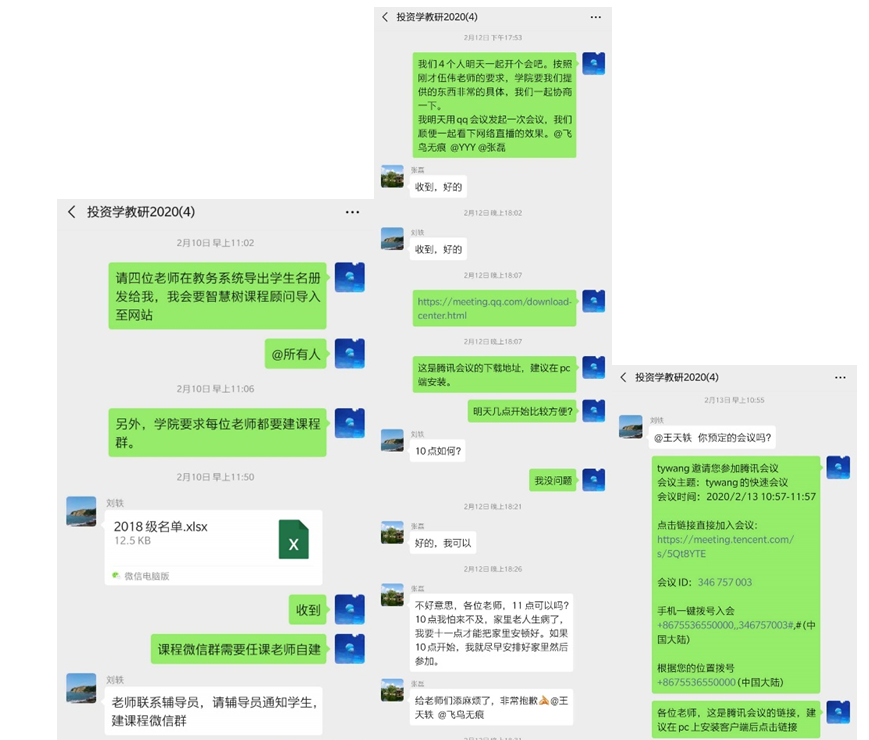 投资学教学团队在收到学院关于新学期教学安排的通知后,第一时间通过微信群通知了团队成员建立课程微信群。王天轶老师于213日在教学团队内发起了腾讯会议,研讨新形势下的在线教学方案。当时,张磊老师恰逢家中老人生病,在需要兼顾家里老人、孩子的情况下克服重重困难,参加团队的在线会议,积极参与研讨,其兢兢业业、一心为学生的精神令所有人感动。