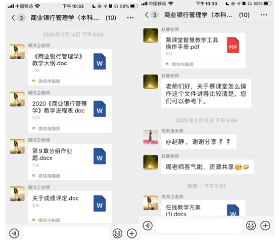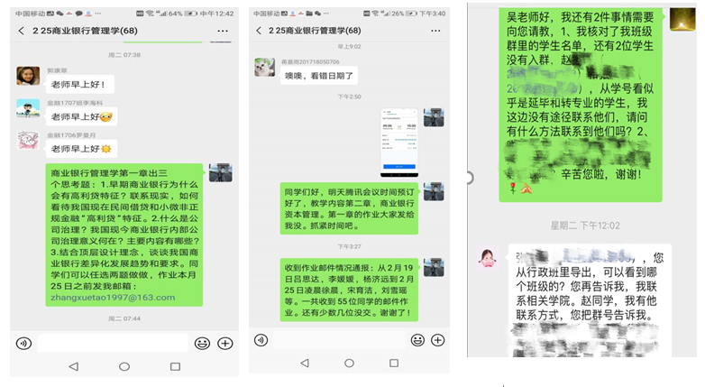 前期的线上教学开展以来,《商业银行管理学》教学团队的老师们通过慕课平台和微信课程群积极与学生互动,授课之余为同学们答疑解惑。