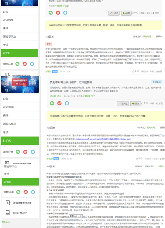 针对《商业银行管理学》课程慕课平台的提问,教学团队老师仔细阅读每一个同学的提问,及时给出专业的回答。由于慕课平台具有对外开放的特点,师生互动不仅限于所任教的本班学生,所有选课的学生均可参与,因此可以实现比线下更广泛的教学互动。