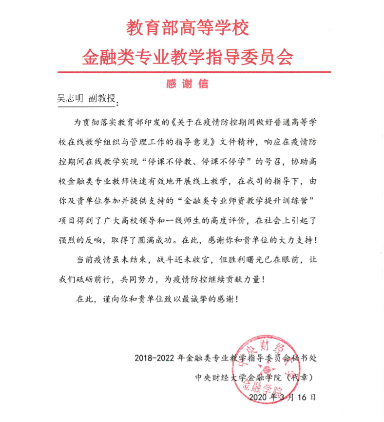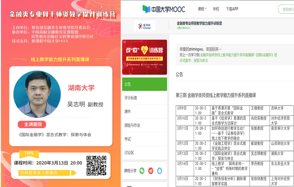 该项直播是教育部金融类专业教学指导委员会、中国金融教育金课联盟主办的“金融类专业教师能力战‘疫’训练营”的内容之一,训练营共邀请来自全国各高校的24位教师分享教学经验。