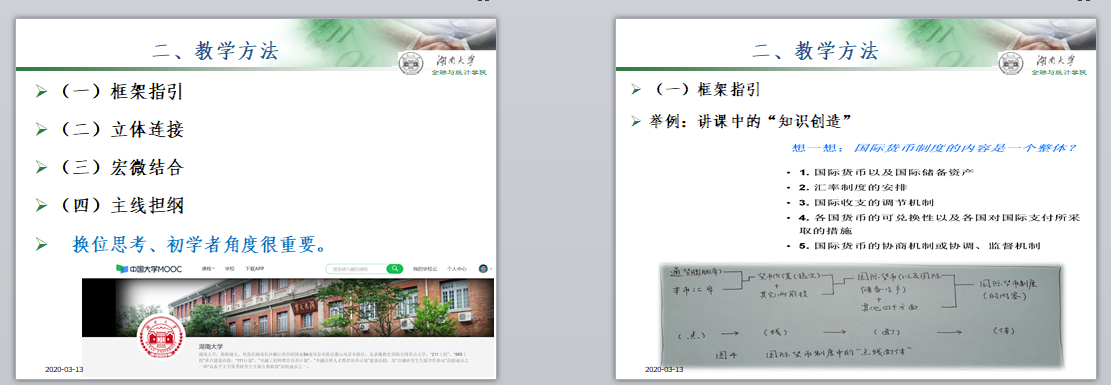 他从框架指引、立体连接、宏微结合和主线担纲四个方面分享教学方法。“框架指引”是指突出知识框架,强调知识的“点线面体”:以主线连接知识点,多条知识主线构成知识面,通过若干个知识面构建知识体系。“立体连接”包括“前后连接”与“纵横连接”。以“第四章国际储备”为例,他进行教学方法示范。“前后连接”,是指师生合作,寻找、归集前三章与第四章的连接点,并将连接点“分门别类”到第四章,以此固化教学效果;“纵横连接”,他示范了 “不同时点的我国外汇储备变动、管理创新比较”(纵向比较)、“不同经济体的外汇储备特征比较”(横向比较)两个教学案例。
