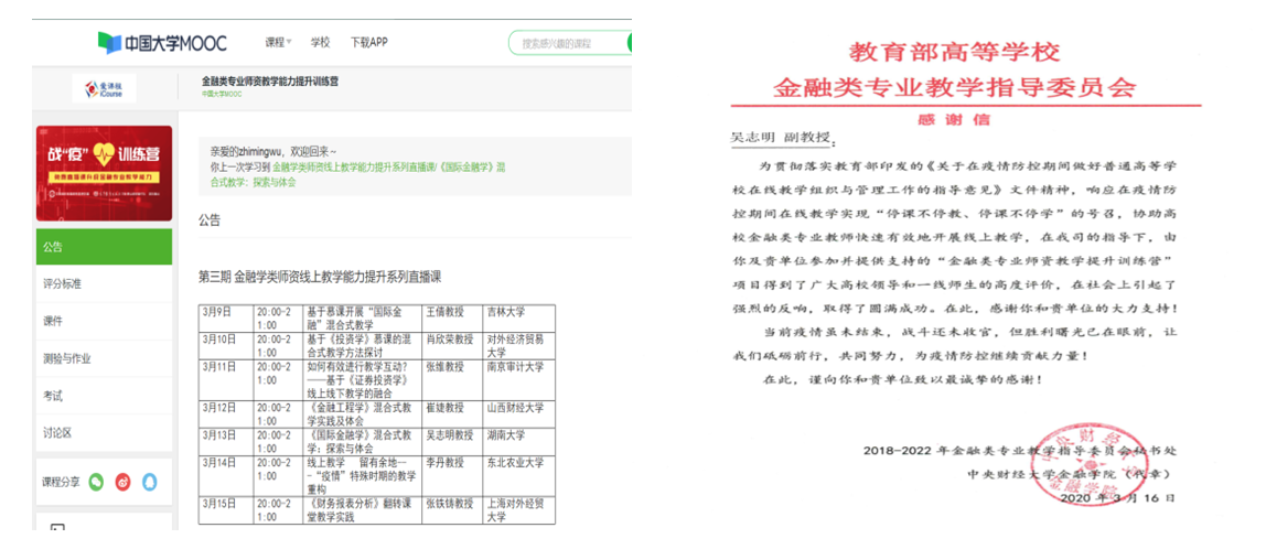 3月13日,省教学成果一等奖获得者、副院长吴志明接受教育部金融类专业教指委邀请,在全国金融类课程“战疫”训练营,做了题为“《国际金融》混合式教学:探索与体会”的直播分享,得到国内同行的好评。