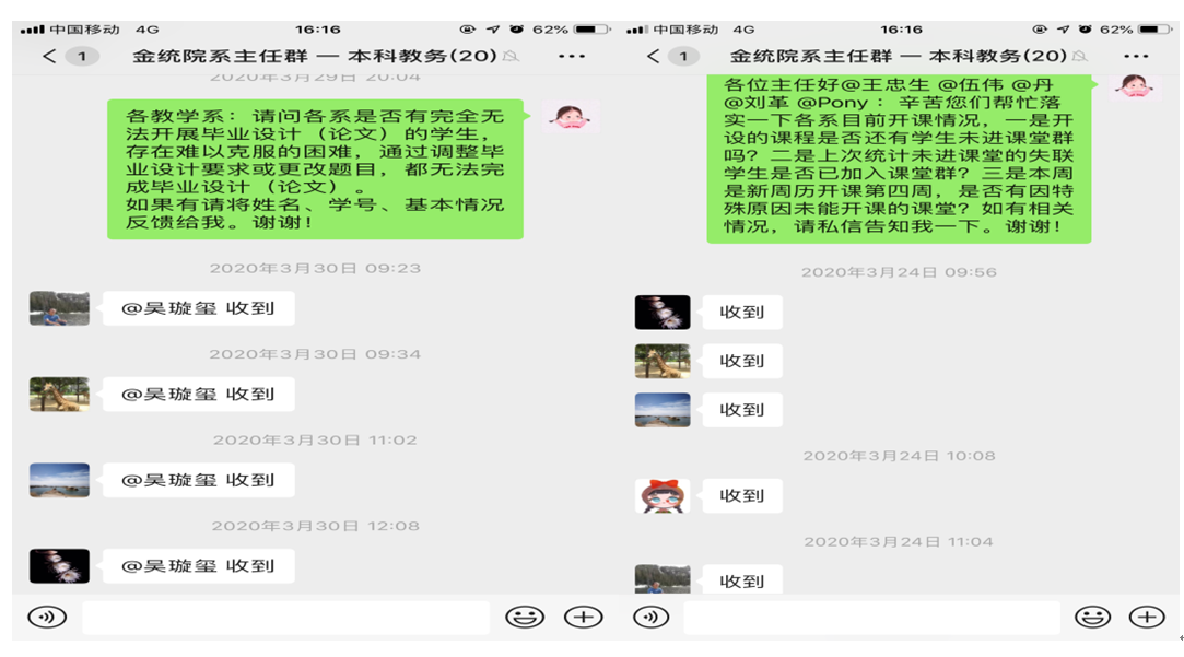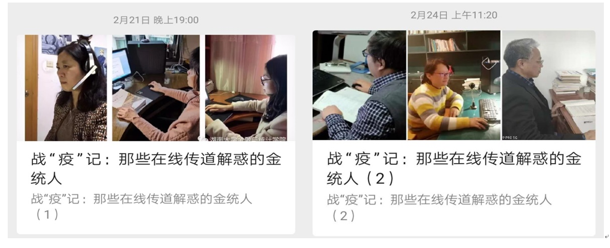 2月17日开课以来,教务办李晖老师,会同校优秀教学秘书、校宣传工作先进个人吴璇玺老师一起,及时联系任课老师,了解在线教学的开展情况。及时总结一周在线教学运行状况;及时提醒授课教师充分做好在线教学多种预案;及时传达学校有关本科教学工作的会议精神。在抗击“疫”情活动中,涌现出一批积极投入教学战“疫”的优秀教师,本科教学管理团队先后推出两期:“战‘疫’记:那些在线传道解惑的金统人”新闻报道,并推出课程团队报道多篇,受到各方的一致好评。