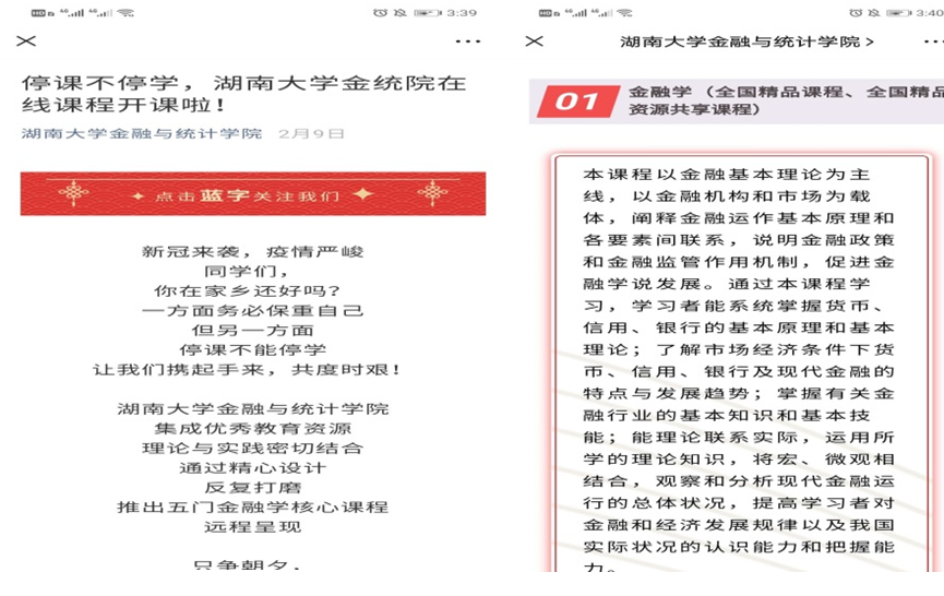2月5日,为了更好推介学院五门金融学MOOC核心在线开放课程,本科教学管理团队在吴志明副院长的组织下,通过微信公众号刊发:“停课不停学, 韩漫 金统院在线课程开课啦!”新闻报道,收到良好的社会反响。