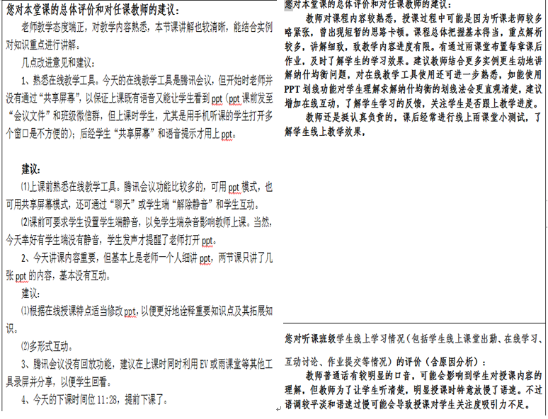 督导们全面关注并综合评价老师们的在线授课内容、教学方式、互动交流、作业布置、辅导答疑、学生学习状况以及教学平台运行情况等,将改进建议及时反馈给教务部门,切实保障线上教学质量。目前,督导组9名督导已对这一阶段开设的 21门专业课程进行了29次的评价和督导。