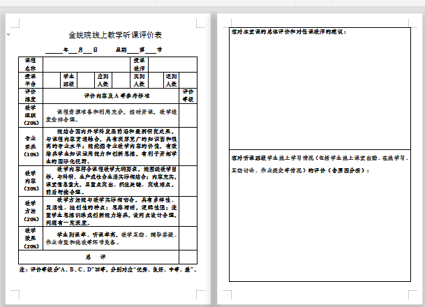 督导组组长张虹老师针对在线教学的特殊性,以原 韩漫 教学听课评价表为基础,设计了金统院线上教学听课评价表,全面客观地评价教师和学生表现。通过督导组微信群,张老师及时发布听课课堂的在线听课链接和二维码,有序组织督导老师对部分老师进行集中督导听课。