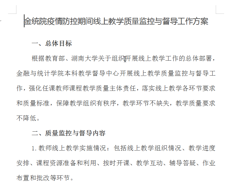 3月13日,学校教务处发布《关于加强本科在线教学质量保障工作的通知》,督导组迅速制定《金统院疫情防控期间线上教学质量监控与督导工作方案》,对学院教学质量监控与督导的内容、方式和分工做出了具体安排,压实督导职责。