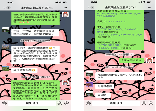 疫情期间,学院本科教学管理工作,日常运行通过“金统院系主任群—本科教务”微信群沟通、落实,重要工作通过在线会议或“一对一”的方式进行线上交流、部署。教学副院长、教学系正副主任和本科教务办老师一起,充分沟通、密切配合,提高了本科教学管理效率,保障了在线教学的顺利进行。
