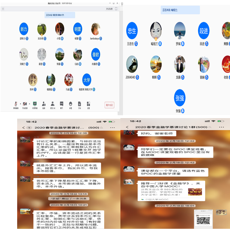 从2月初开始,货币金融系主任陈珂、副主任王忠生组织全系老师学习雨课堂、腾讯会议、QQ课堂、超星学习等多种在线教学工具。本学期,货币金融系全部课程均采用多种授课模式,包括MOOC/SPOC课程4门,课堂24个;直播授课课程8门,课堂34个;录播课程2门,课堂6个;互动式自主学习模式10门,课堂44个。《金融学》团队、《国际金融学》团队,通过课程群就混合式教学、教学平台、授课方式、MOOC/SPOC使用教程、教学进程表、电子教材、评价标准、应急预案、混合式教学计划和教学大纲的修订等工作进行反复沟通讨论。《外汇交易理论与实务》、《中央银行学》等课程,均通过微信工作群讨论在线教学手段、课程改革内容、成绩结构比例,在达成共识的基础上,最终确定最合适的在线教学方式。开学以来,货币金融系所有课程均已实现线上线下或线上教学全覆盖,课堂授课及学习效果良好。
